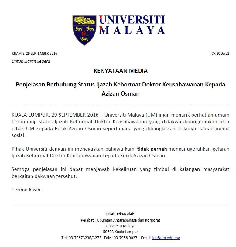 Universiti Malaya (UM) ingin menarik perhatian umum berhubung status Ijazah Kehormat Doktor Keusahawanan yang didakwa dianugerahkan oleh pihak UM kepada Encik Azizan Osman sepertimana yang dibangkitkan di laman-laman media sosial.